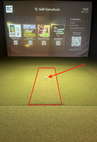 Det korta svaret är att du ska placera bollen ungefär i mitten av slagmattan. Om du spelar på en matta utan tydlig slagyta kan du istället linjera upp bollen så att den ligger precis framför den orange enheten i boxen vid skärmen – det är TrackMan-enheten som registrerar dina slag. Nedan ser du en bild på var man ska ha bollen.